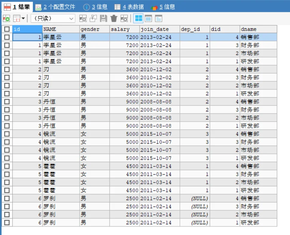-- 问题:李星云明明属于研发部(1),结果里却出现了他属于市场部(2)、财务部(3)的错误记录。必须添加连接条件,通常是 子表.外键 = 父表.主键。