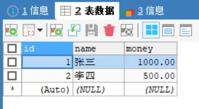 INSERT INTO account (name, money) VALUES ('张三', 1000.00), ('李四', 1000.00);模拟转账异常