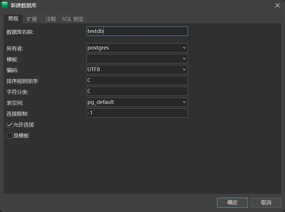 CONNECTION LIMIT = max_connections;最简单的创建方式是指定数据库名称,其他参数均采用系统默认值。PostgreSQL 会自动应用默认编码(通常为 UTF8)、默认表空间,并且不限制连接数。