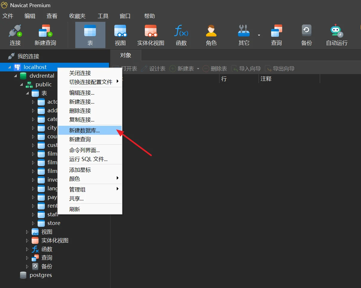 在左侧连接树中,右键点击已连接的 PostgreSQL 实例。