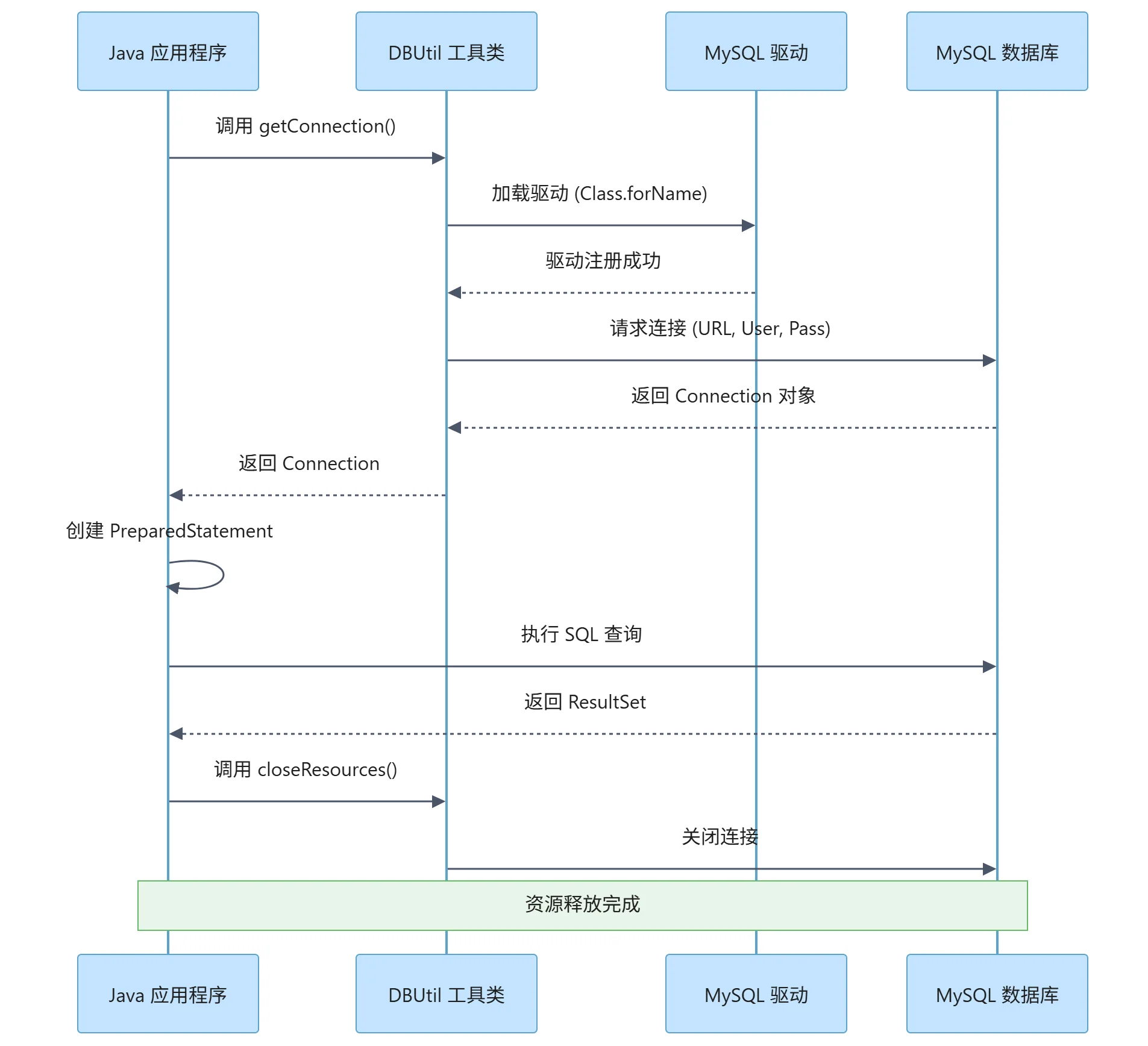 }遵循“后开先闭”原则,依次关闭 ResultSet、Statement 和 Connection。
