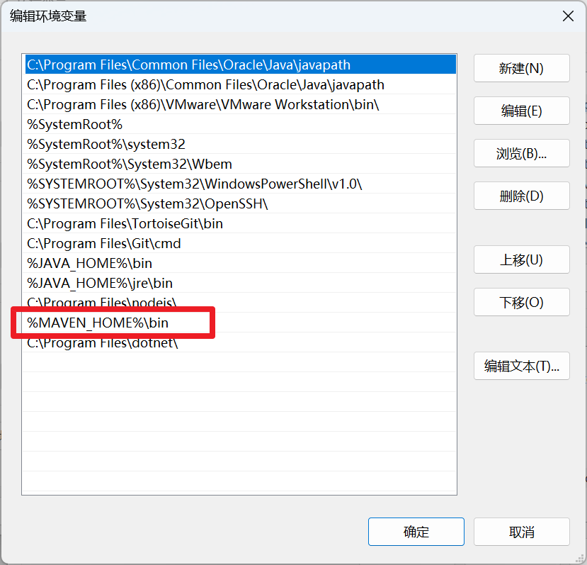 操作:在现有变量值末尾追加 %MAVEN_HOME%\bin (Windows) 或 $MAVEN_HOME/bin (Linux/Mac)。
