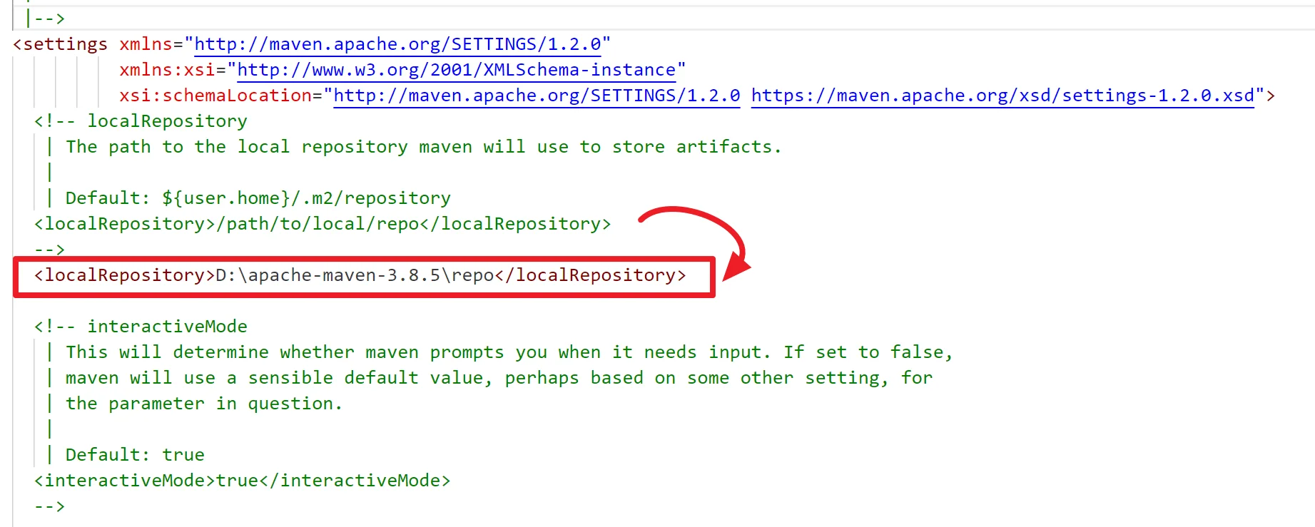 编辑 settings.xml,找到 <localRepository> 标签(默认被注释),取消注释并修改路径: