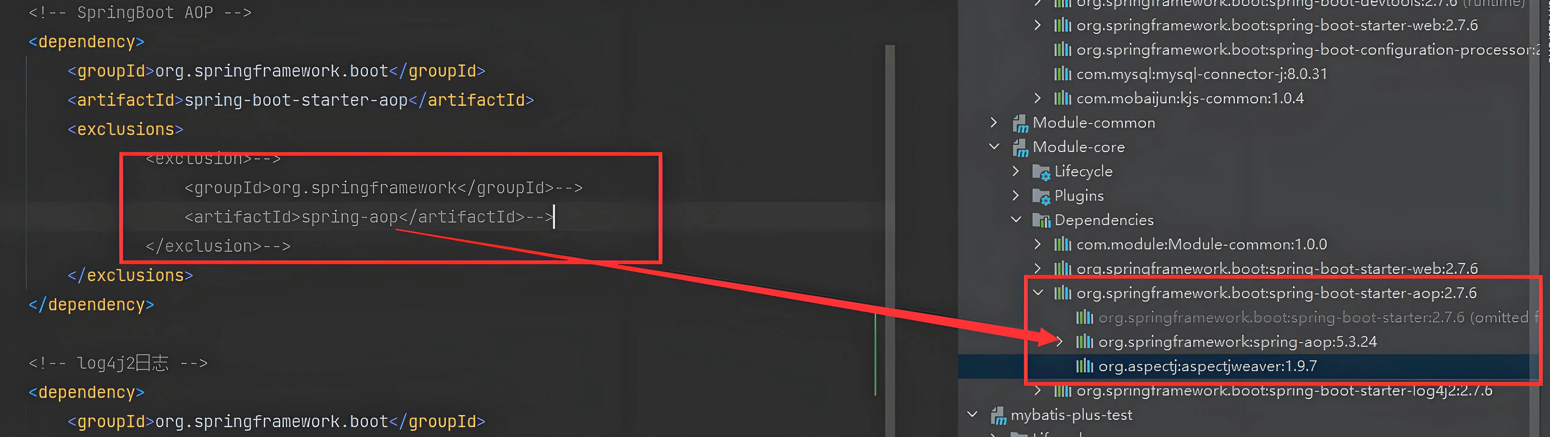 </dependency>精确匹配:<exclusion> 中的 groupId 和 artifactId 必须与要排除的依赖完全一致。