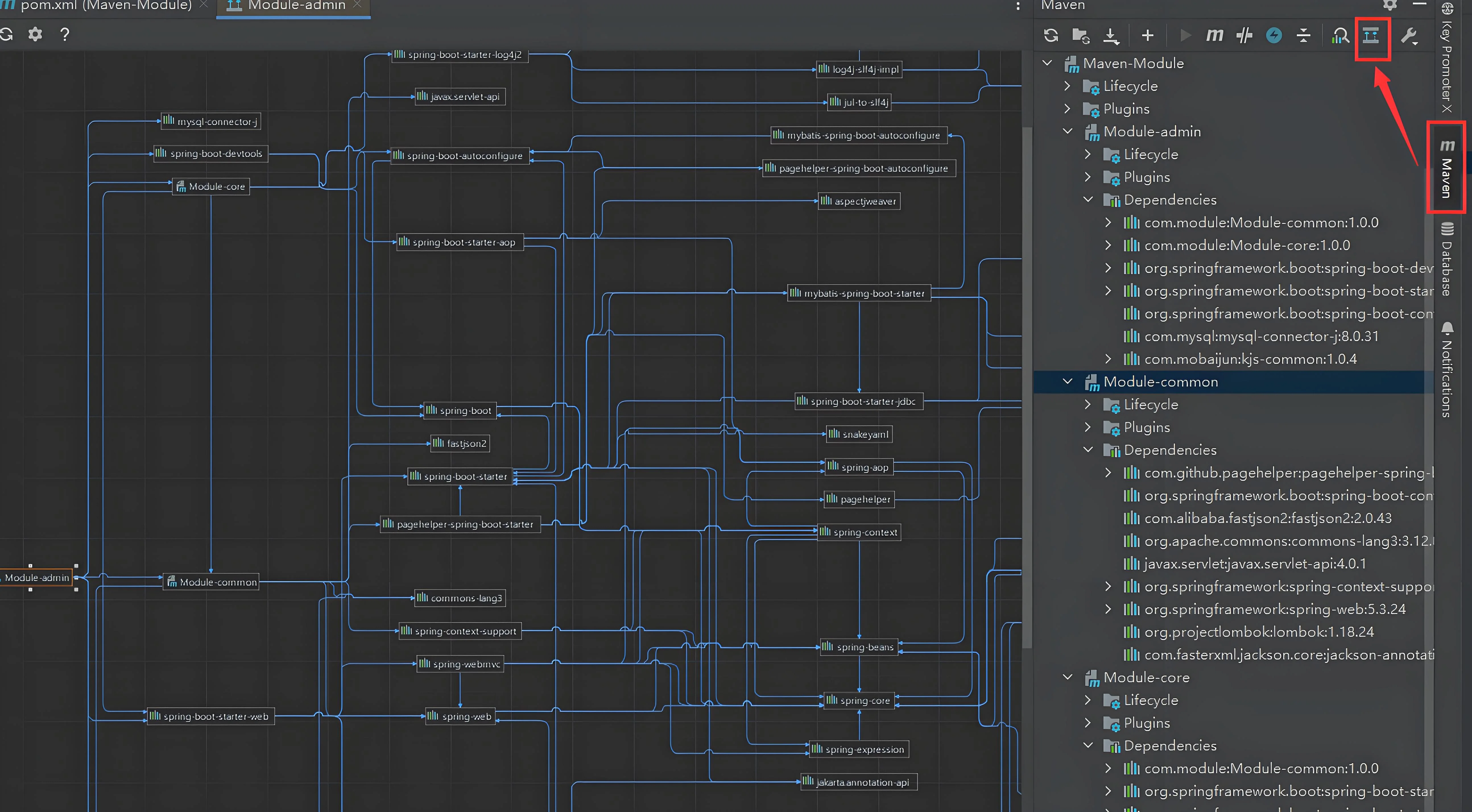 或者在右侧 Maven 面板,点击图标 Show Dependencies。