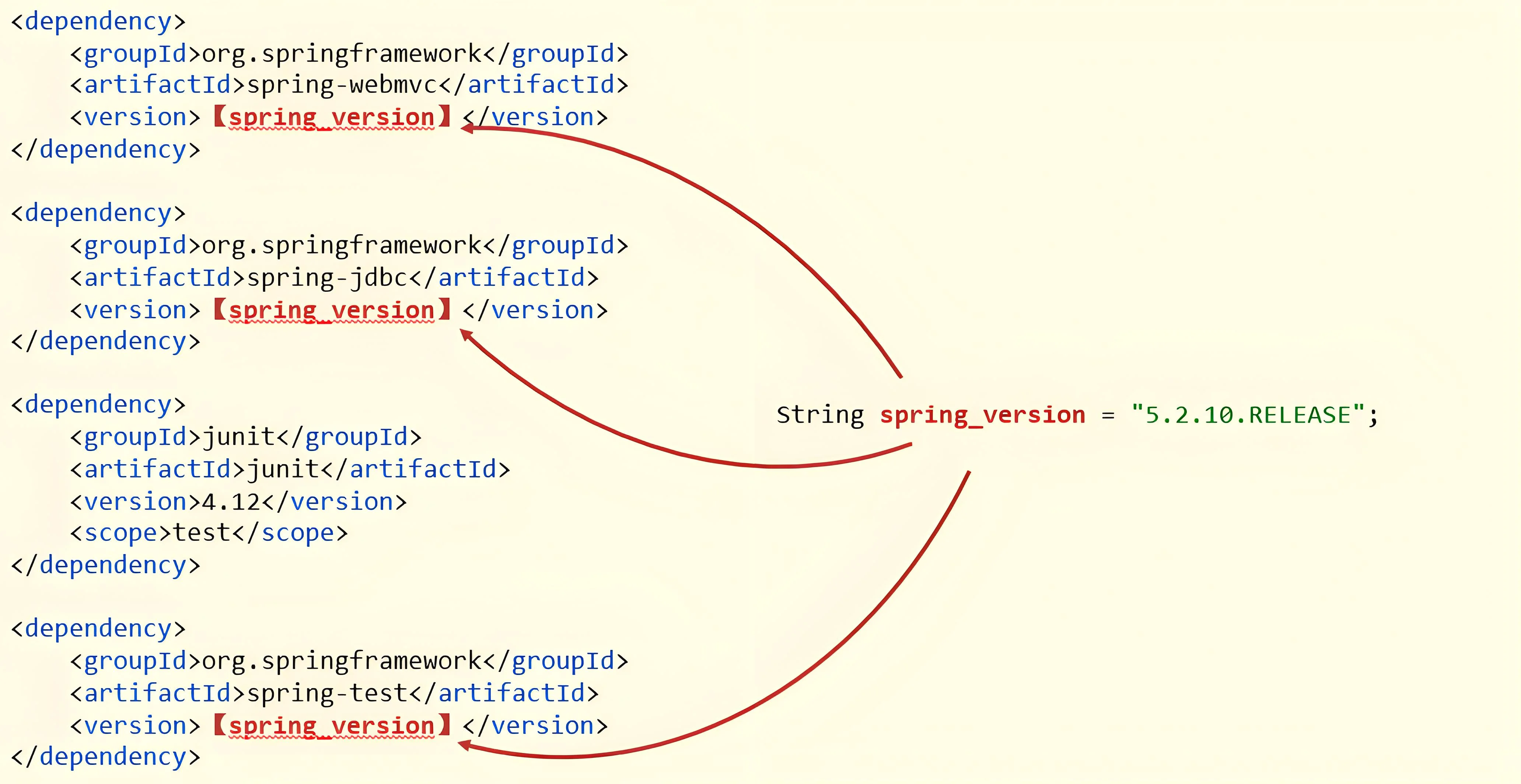 <properties>或<dependencyManagement>中统一管理。