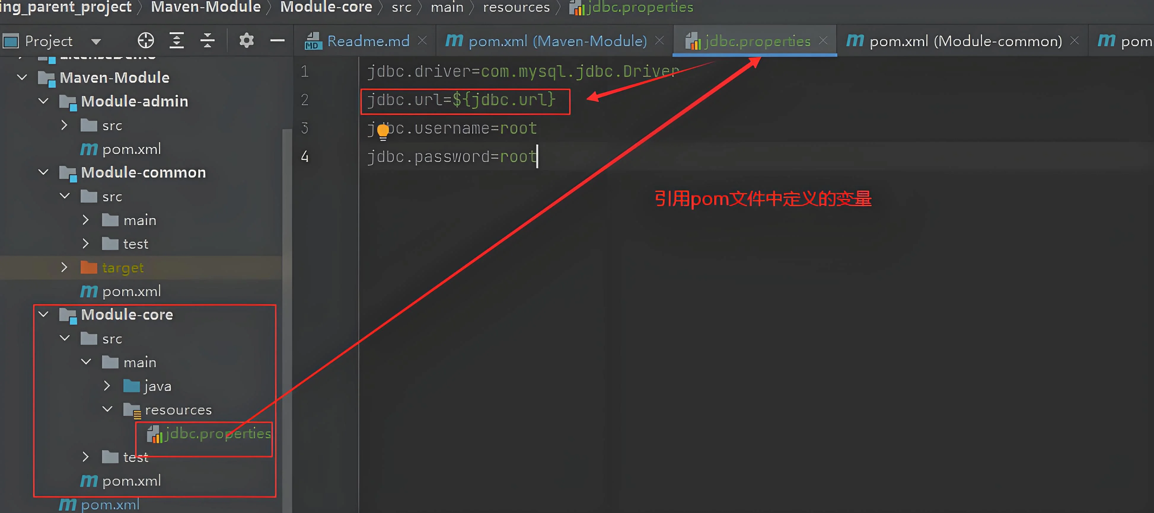 在 src/main/resources/application.yml 或 jdbc.properties 中直接使用占位符。