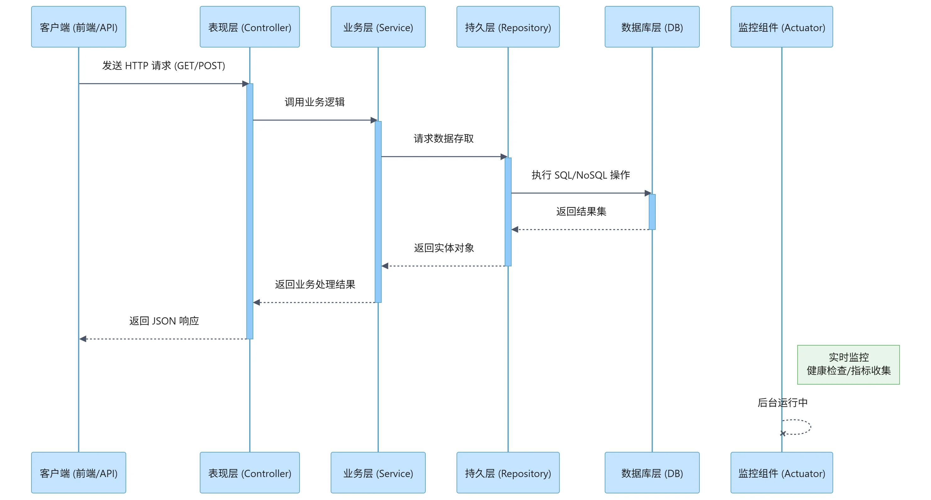 响应返回:处理完成后,数据逐层返回,最终由控制器层转换为 JSON 格式并作为 HTTP 响应发送回客户端。