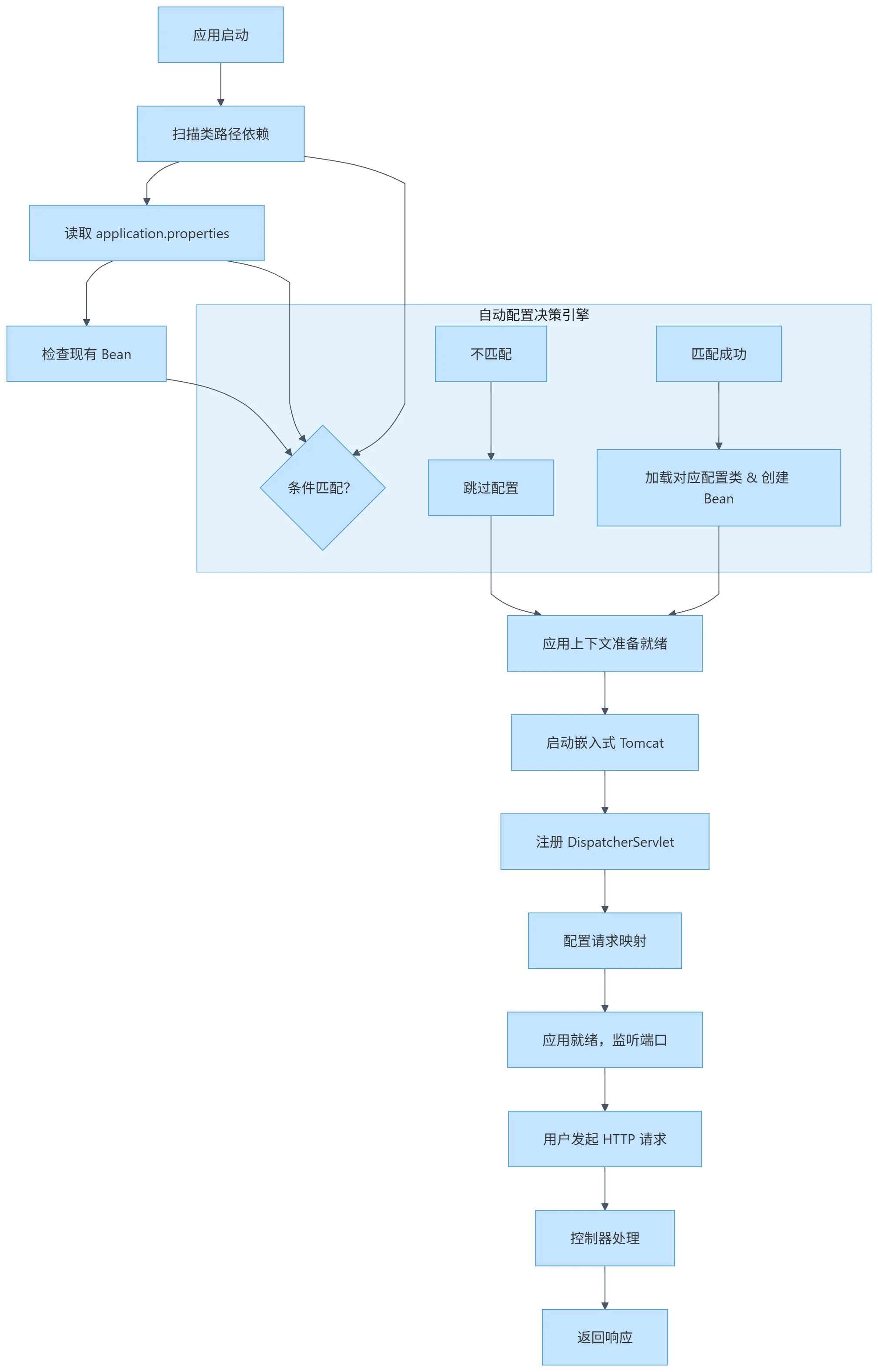 }当应用启动时,Spring Boot 会立即扫描类路径,并根据发现的依赖项自动配置相应的 Bean。