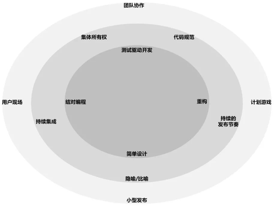 极限编程的落地实践可从环境、规范、动作三个维度划分,覆盖经典 12 项 XP 实践: