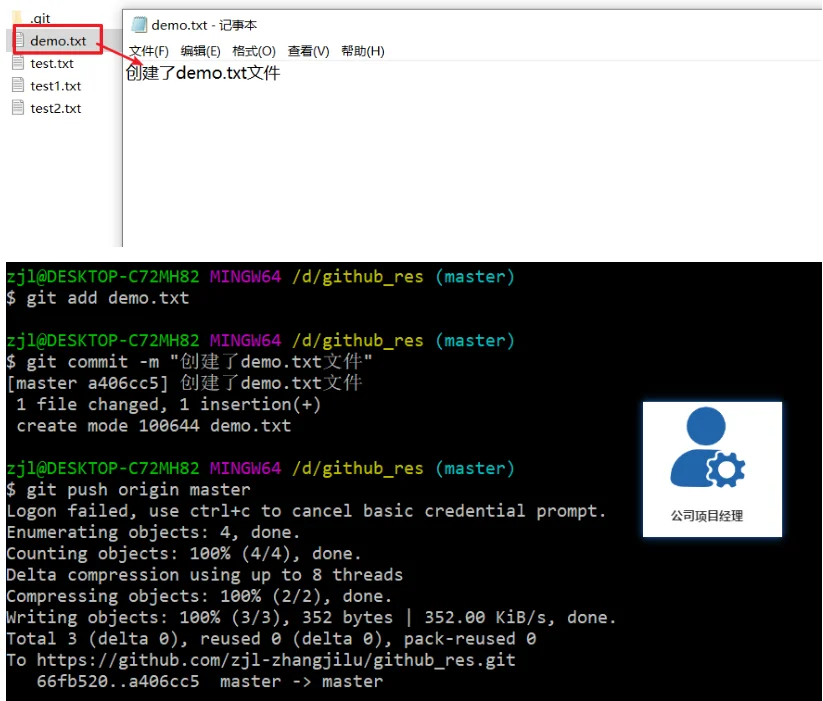 项目经理创建文件并编辑内容,执行 add、commit、push 推送到远程仓库