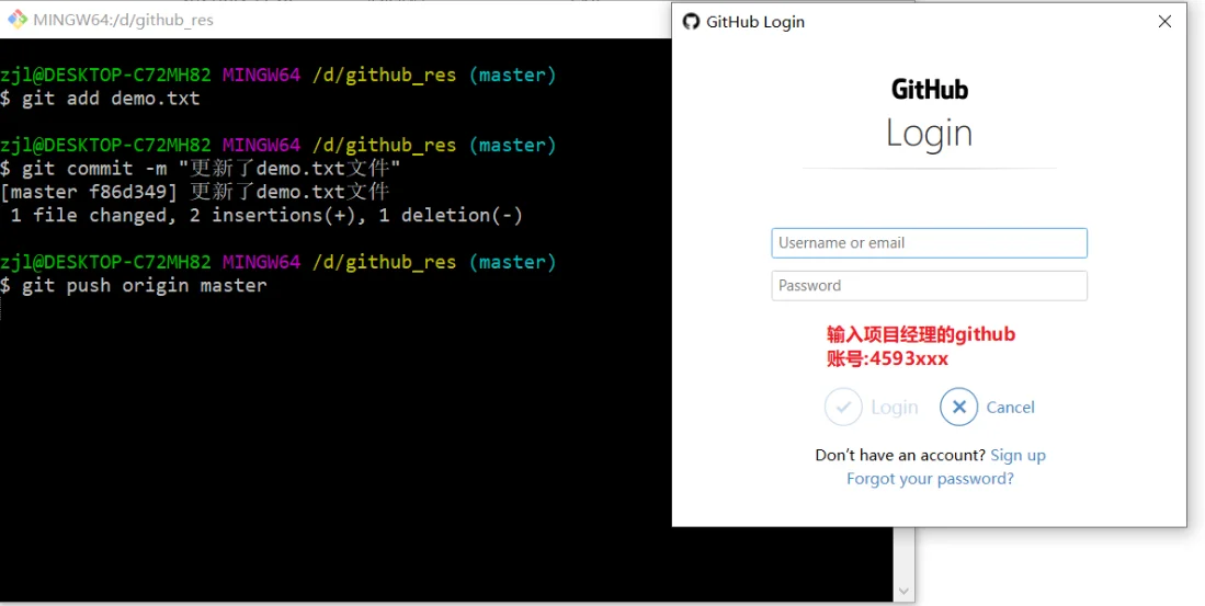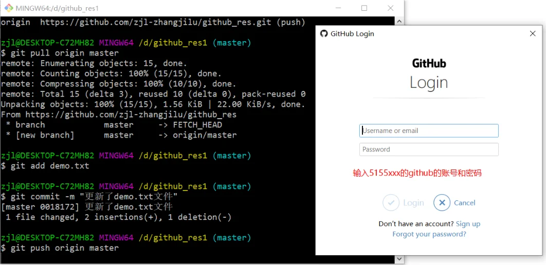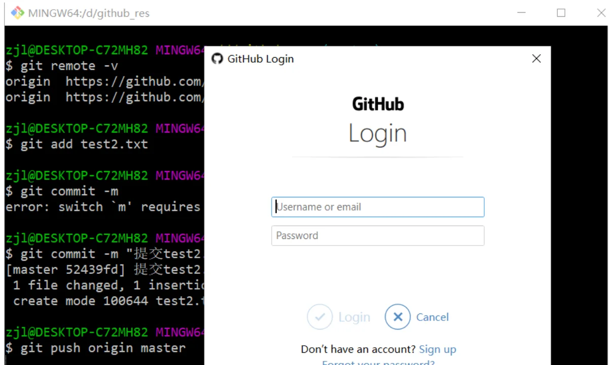 git push origin master控制台执行命令后,按提示输入 GitHub 用户名和密码,点击 Login