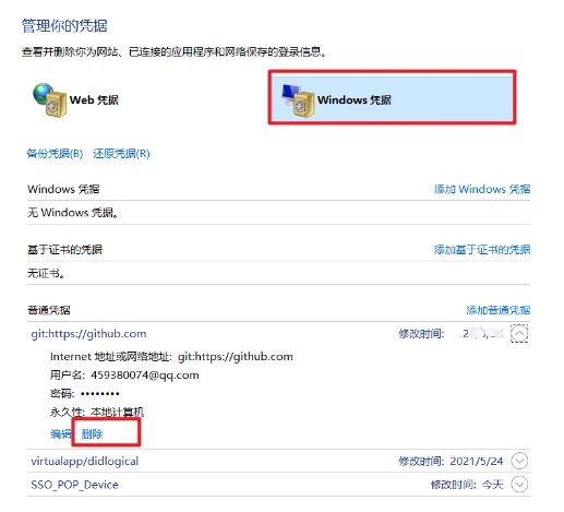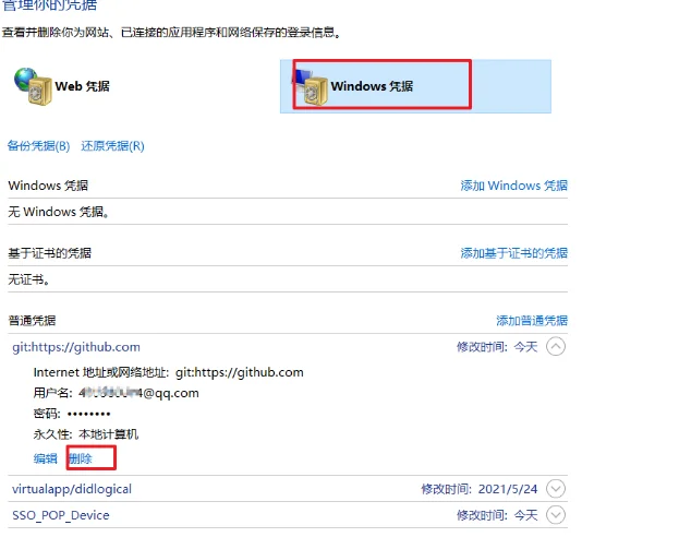 同一台电脑切换账号时,Git 会缓存用户名和密码,需要先清除缓存,才能正常切换身份。