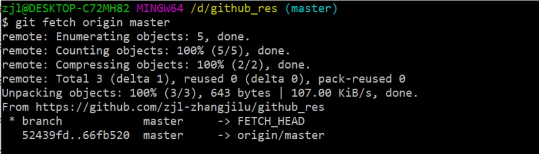 注意:git fetch 只会拉取到本地版本库,不会更新工作区文件。