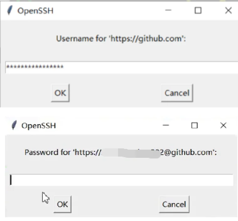 部分环境会弹出 OpenSSH 验证界面,继续输入 GitHub 用户名和密码