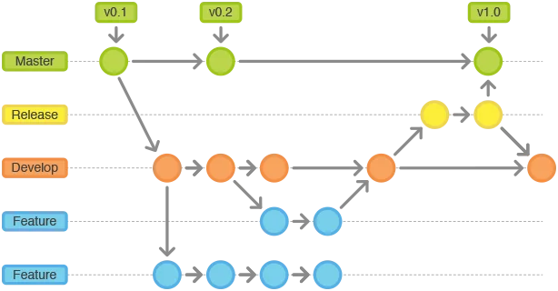 GitFlow 在特性分支基础上,进一步规范了分支创建、合并、版本发布、历史版本修复的完整流程。