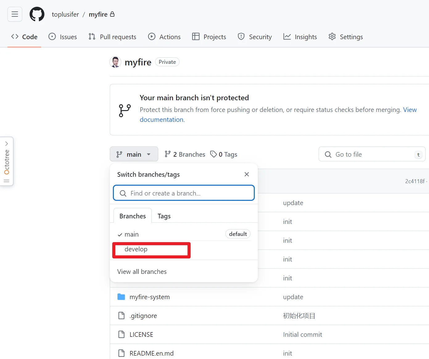 第一步为默认的 master 分支配套 develop 分支,由一名开发者本地创建后推送到远程。