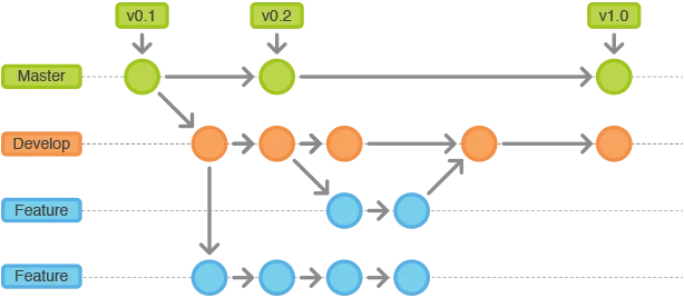 团队成员分别开发新功能,必须从 develop 拉出功能分支,不能使用 master。