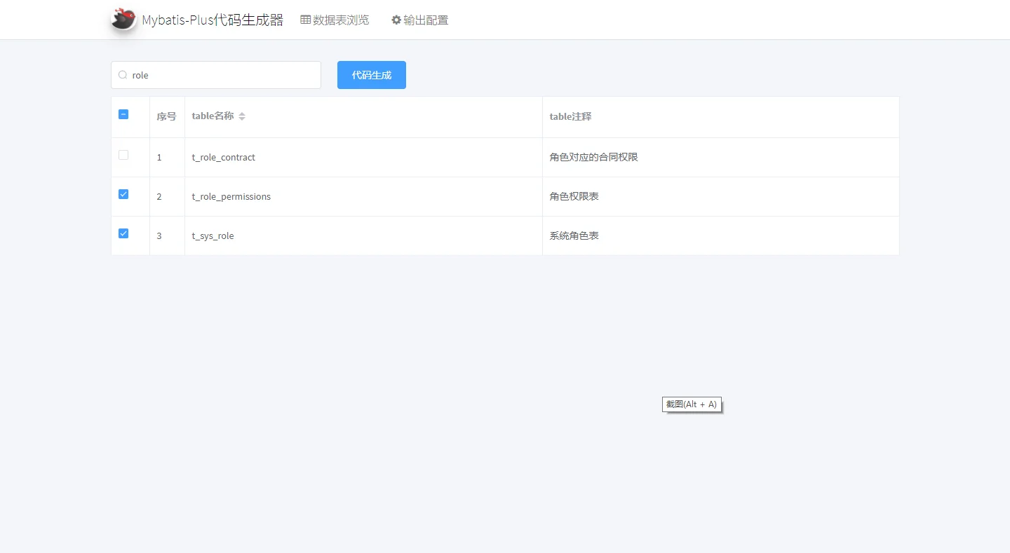 可直接浏览和查询数据库内的所有数据表,支持单选、多选任意数据表,快速选中后生成对应的全套模板代码。