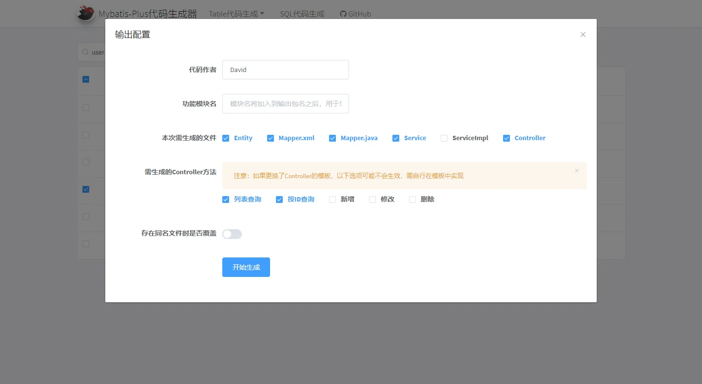 生成代码前建议开启文件覆盖保护,避免误删已有代码;