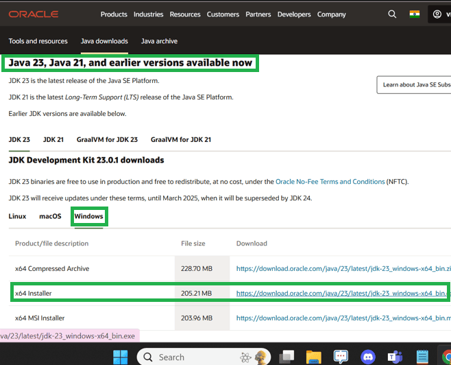 步骤 2:现在你可以看到最新版本是 JDK 23,并提供了 Linux、macOS 和 Windows 的下载选项。点击 Windows 选项,然后选择 x64 Installer 以下载适用于 64 位 Windows 系统的 .exe 安装文件