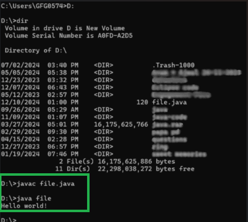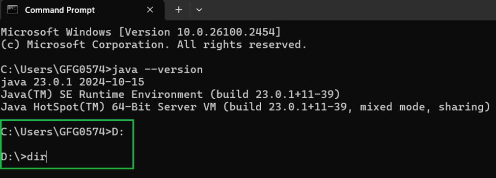 打开命令提示符,切换到 Java 文件所在的 D 盘。为此,首先输入以下命令切换到 D 盘