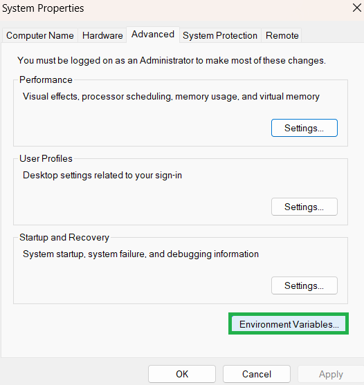 在系统中搜索“环境变量”,然后点击“环境变量”按钮