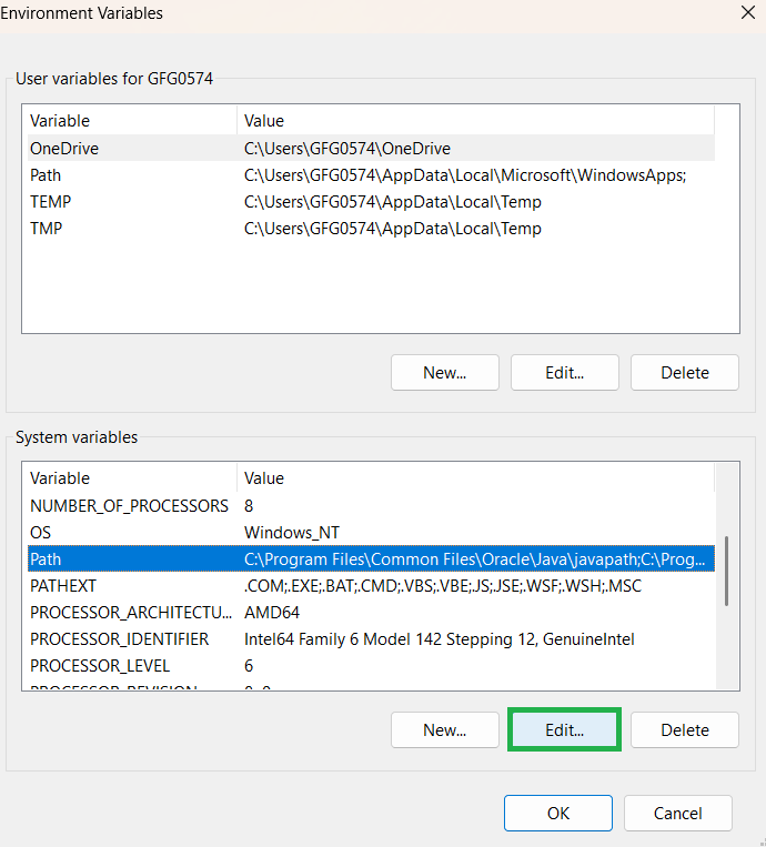 在“系统变量”部分,选中 Path 变量,然后点击“编辑”按钮